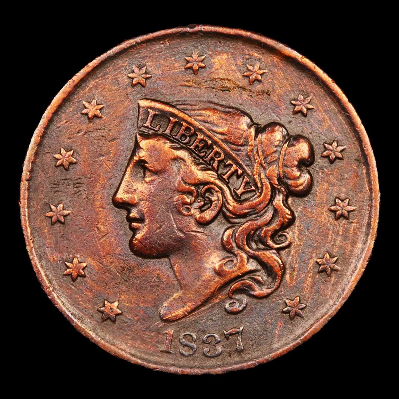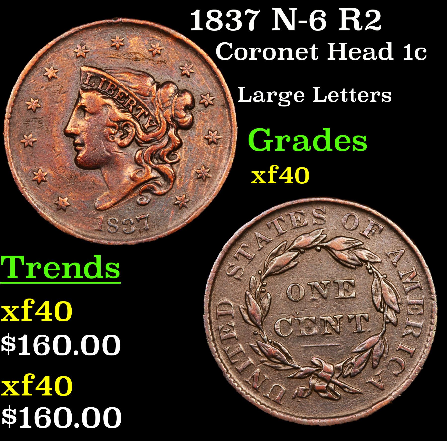 1837 N-6 R2 Coronet Head Large Cent 1c Grades xf.