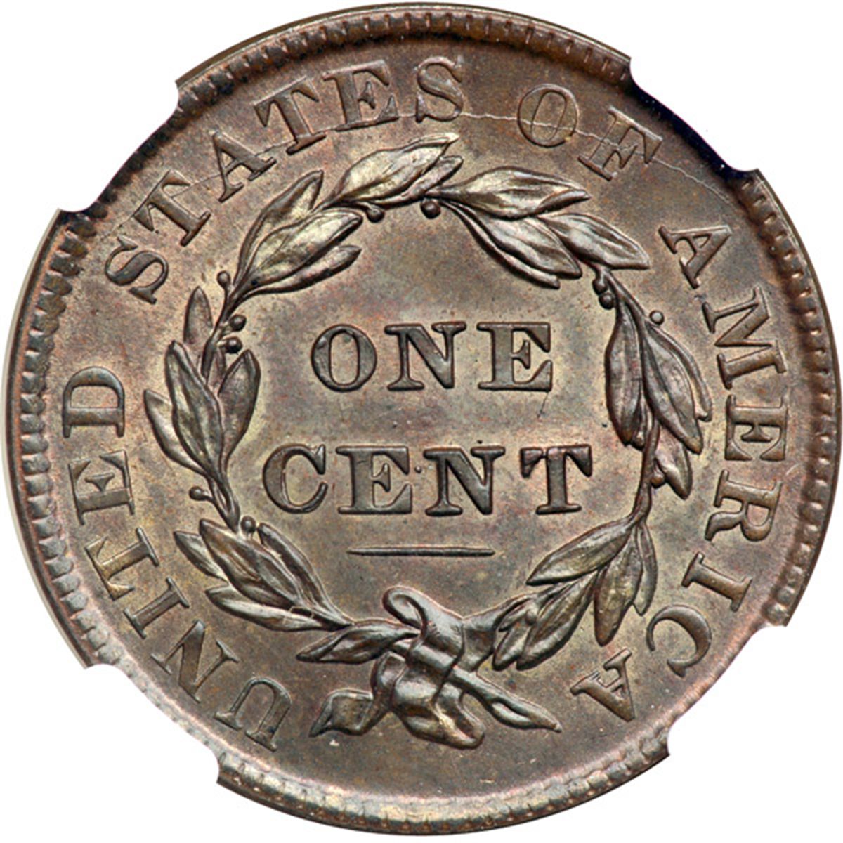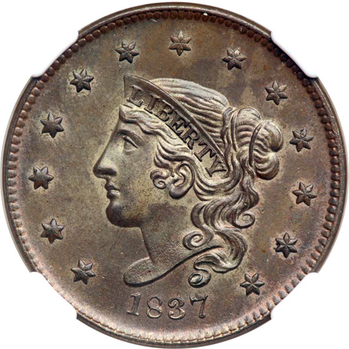 1837 N-7/8 R1 Plain Hair Cord NGC graded MS66 Brown. Lustrous very light olive brown with satiny golden light steel toning covering the protected areas on both sides. The surfaces are virtually flawless. The best identifying marks, and they are trivial, are some very slightly darker toning covering the neck and a microscopic tick on the upper left point of star 3. MDS. The die lines of the early state over ERICA (the N-8 die state) are gone but the dentils are complete around both sides. Our grade is MS63. The attribution is noted on the NGC label.