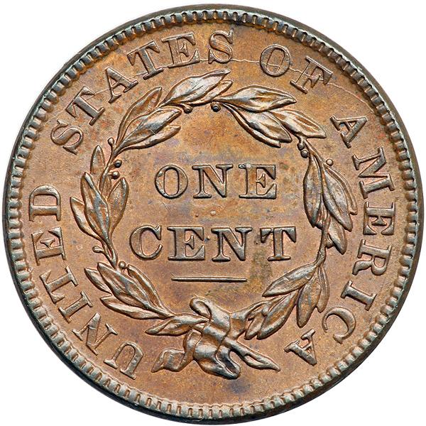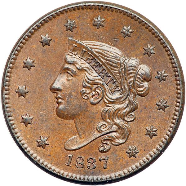 1837 N-8/7 R1 MS60. PCGS graded MS-64. Frosty light brown with steel brown highpoints and traces of mint red in protected areas. The only mark is a small area of darker olive brown toning under the ribbon loop at the bottom of the reverse. E-MDS. The die lines over MERICA are dull but clearly visible. Andrews and Newcomb would have considered this #8 in their classification systems. Called AU55 in the Noyes census, his photo #27925. Our grade is MS60. Pop 1; 1 in 67BN. DWH #2472.