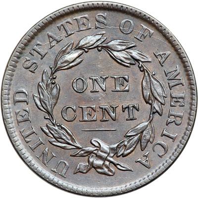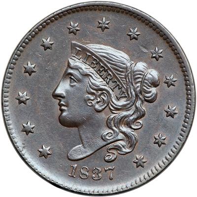 1837 N-8 R1. EF-45. Plain Hair Cord. Frosty olive and steel brown with traces of lighter steel brown faded down from mint color in protected areas. Satiny mint luster covers the protected areas. Excellent eye appeal, nearly flawless. A shallow planchet flake left of star 9 is the best identifying mark. MDS. The die lines over MERI are gone (Newcomb's old #7).