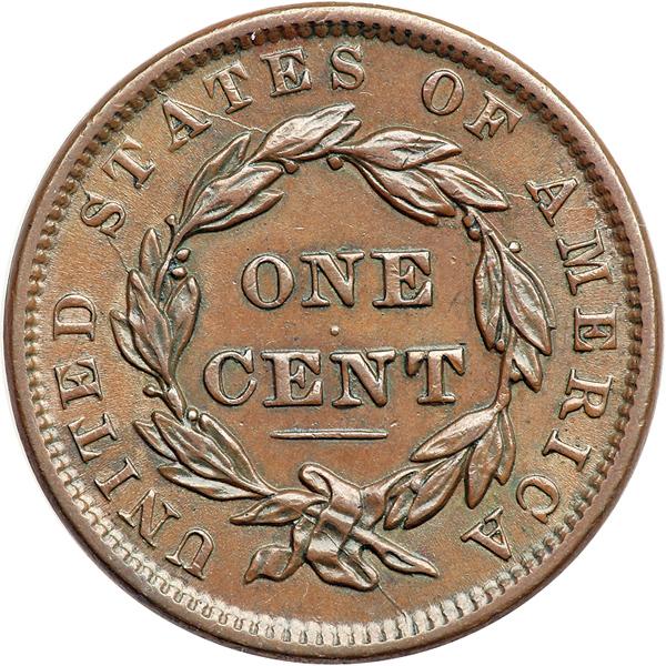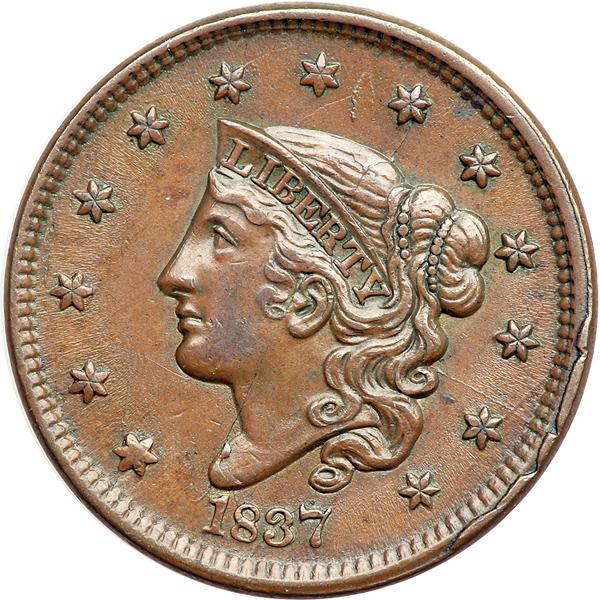 1837 N-9 R1 EF45+. Beaded Hair Cord. Near Terminal Die State. EF-45+. Very attractive glossy medium brown with frosty flowline luster covering the fields and protected areas. Just a few trivial contact marks and absolutely choice except for a small, dull nick on the chin. Still very close to AU50. Near terminal die state with a series of strong rim cuds extend from star 11 down to star 13 (in the terminal state these cuds reach to below the 37 in the date). All the die cracks are stronger and there are some curious die scratches near the dentil tips at star 2 and between stars 3 & 4. These odd marks near the dentils might look like circulation damage at first glance, but they are die damage that remains constant on all the very late die state examples seen. Removed from an NGC slab graded MS62BN (NGC label included, and it shows the attribution and Reiver provenance). DWH #2950.