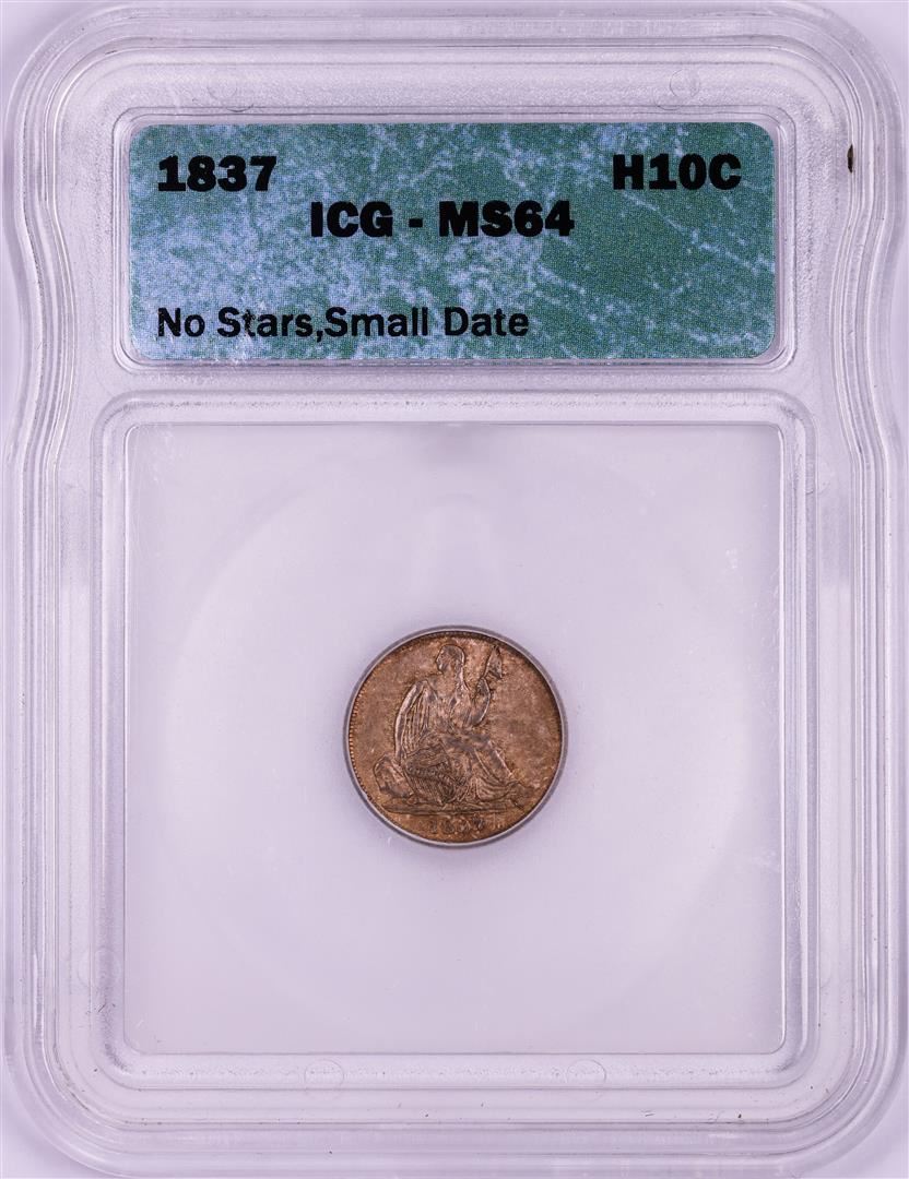 One 1837 No Stars Small Date Seated Half Dime Coin ICG MS64. ICG Certified.