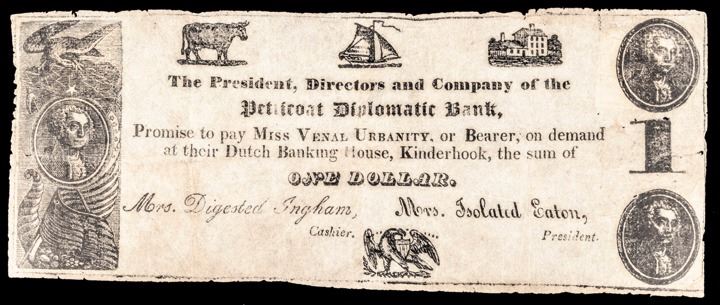 (1837) Not dated, Printed Political-Satirical Note, Kinderhook, (NY), “Petticoat Diplomatic Bank,” “Pay Miss Venal Ur(b)anity One Dollar,” PMG graded Fine-12.