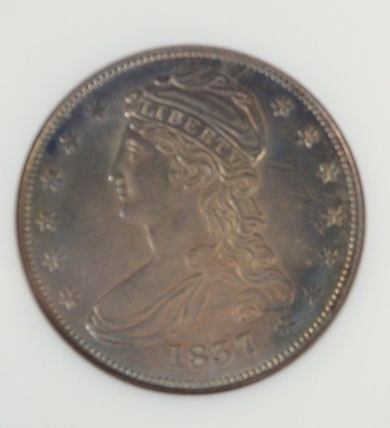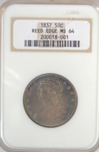 1837 REEDED EDGE BUST HALF DOLLAR NGC MS64 BEAUTIFUL BLUES, GOLD, SUPER LUSTRE