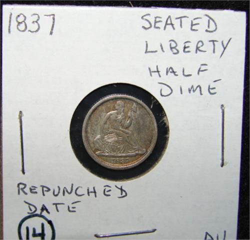 1837 SEATED LIBERTY HALF DIME. AU. Repunched date.