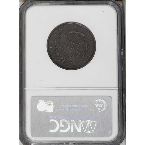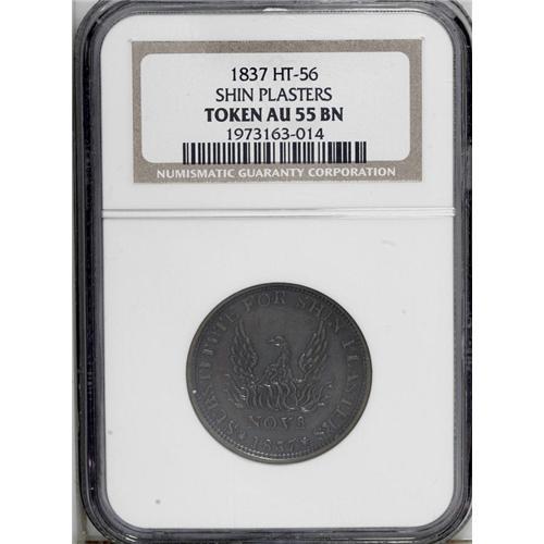 <B>1837 Substitute for Shin Plasters, Low-46, HT-57, R.1, AU55 NGC.</B></I> NGC has misattributed the piece as HT-56 which, unlike HT-57, has a berry beneath the second E in DEFENCE. A phoenix rises from the flames, in a departure from the Liberty head type. This glossy mahogany-brown piece is well struck, and has exceptionally pleasing surfaces. The allusion to shin plasters refers to the worthless issues of many of the broken banks of the period. The device of the phoenix rising from the flames seems to mean that paper money was only fit to be burned, and that with its destruction new life would spring from its ashes.<BR><I>From The Troy Wiseman Collection.</B></I>