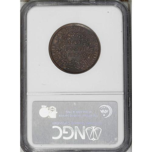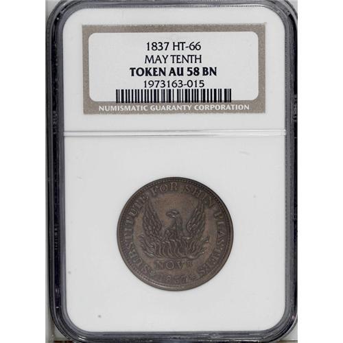<B>1837 Shin Plasters--May Tenth, Low-47, HT-66, AU58 NGC.</B></I> The obverse field is light tan-brown, while the reverse is mostly mahogany-brown. A sharp representative with a clean reverse and only a couple of tiny obverse marks. The date May Tenth 1837 refers to the market crash at that time.<BR><I>From The Troy Wiseman Collection.</B></I>