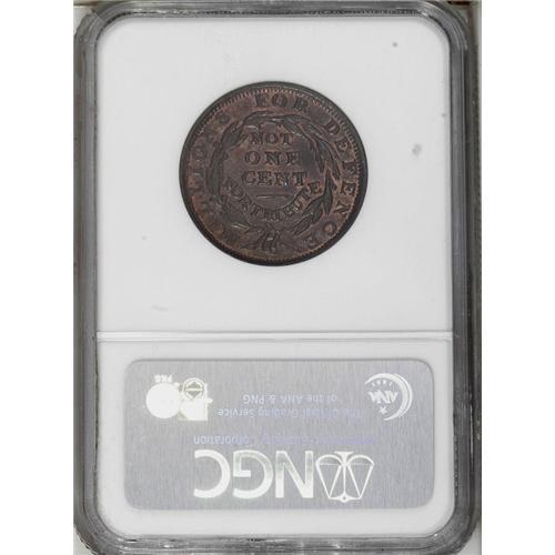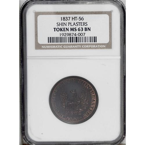 <B>1837 Shin Plasters--Not One Cent, Low-45, HT-56, MS63 Brown NGC.</B></I> Designated as Brown by NGC, but orange luster glows from the recesses. The obverse field displays deep mahogany patina, while the reverse field is medium brown. A splendid example of this popular type. The reverse die is the same used for HT-48, confirmed by an identical flaw on the N in DEFENCE.<BR><I>From The Troy Wiseman Collection.</B></I>