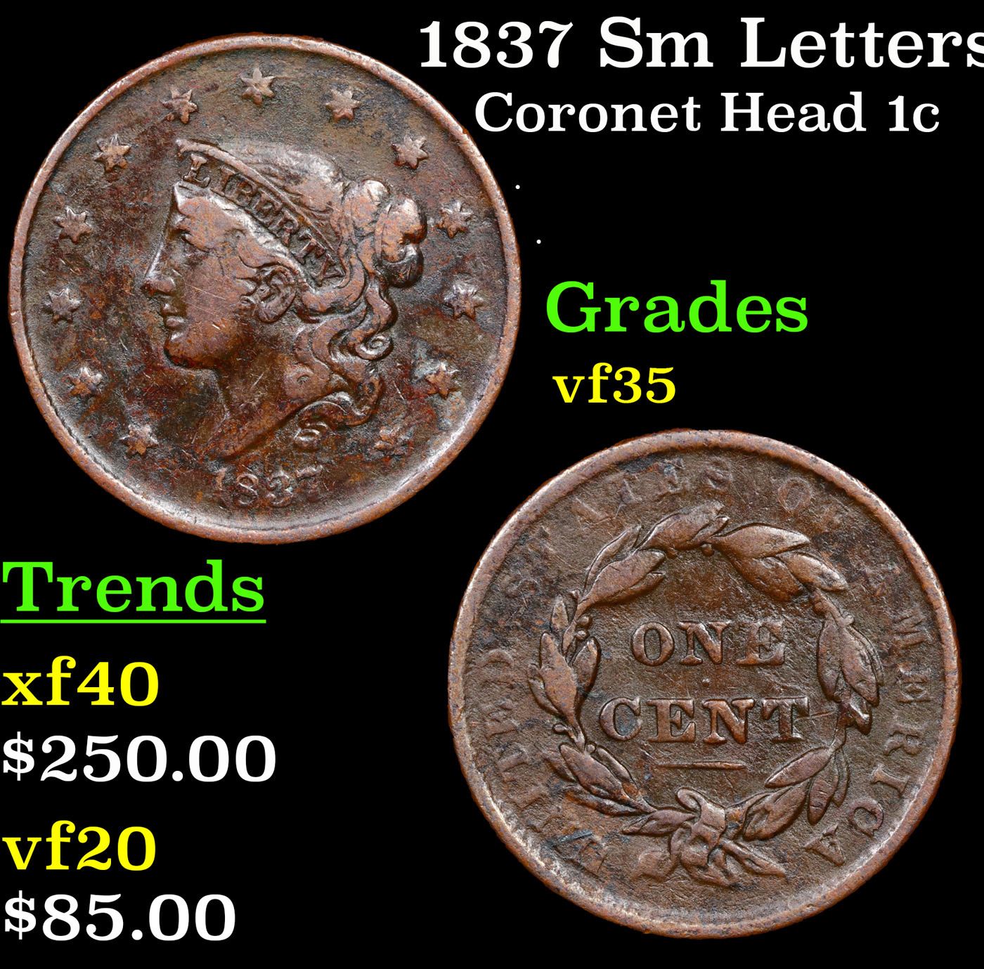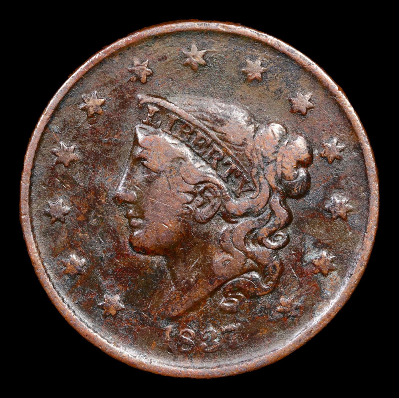 1837 Sm Letters Coronet Head Large Cent 1c Grades vf++.