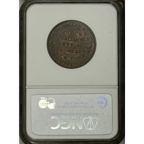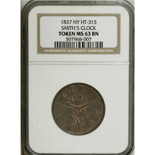 <B>1837 Smith's Clock Hard Times Token, Low-136, HT-315, MS63 Brown NGC.</B></I> Smith's Clock of New York issued at least five varieties of Hard Times tokens. Low-136 is identified by the small sprigs at 3 and 9 o'clock on the reverse. Mint red color outlines protected areas, while the fields have mellowed in deep golden-brown hues. A few tiny spots are found upon thorough examination.<BR><BR><b>Shipping:</b> Coin/Currency (<a target="_blank" href="http://www.heritageauctions.com/common/shipping.php">view shipping information</a>)