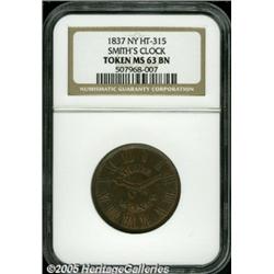 <B>1837 Smith's Clock Hard Times Token MS63 NGC.</B></I> Low-136, HT-315. Smith's Clock of New York issued at least five varieties of Hard Times Tokens. Low-136 is identified by the small sprigs at 3 and 9 o'clock on the reverse. Mint red color outlines protected areas, while the fields have mellowed in deep golden-brown hues. A few tiny spots are found upon thorough examination. <BR><I>Ex: F.C.C. Boyd; John J. Ford, Jr. Collection, Part IV (Stack's, 6/04), lot 272.</B></I>
