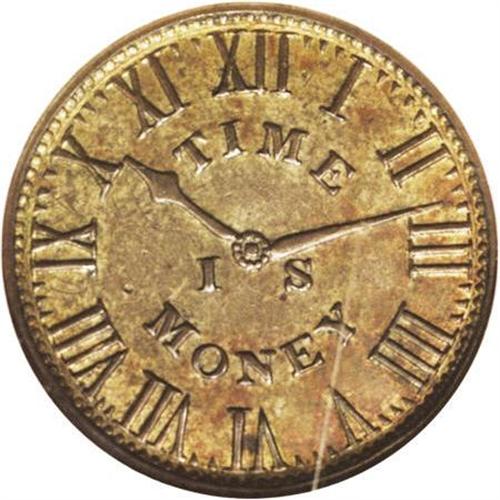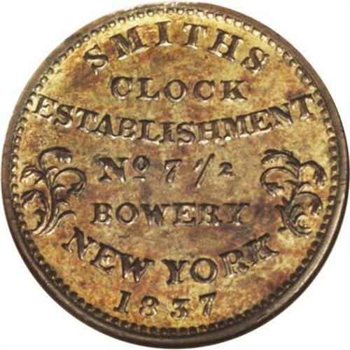 <B>1837 Smith's Clock, Low-138A, HT-317A, R.7, New York, NY, MS62 NGC.</B></I> Gilt copper. From the same dies as the common Low-138, but gilt, as issued. Gold, olive, and dove-gray toning graces this sharply struck example. A few moderate marks are on the left half of each side, and a spot is present beneath the Y in BOWERY.<BR><I>Ex: John J. Ford, Jr. Collection Part IV (Stack's, 6/04), lot 275. Ford purchased the piece from Julian Leidman on 8/21/68.</B></I><BR><I>From The Troy Wiseman Collection.</B></I>