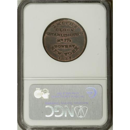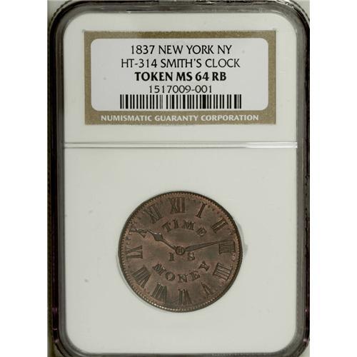 <B>1837 Smith's Clock, New York, NY, MS64 Red and Brown NGC.</B></I> Low-135, HT-314. The open fields are steel-blue, but considerable mint red resides within the legends and devices. A charming example from this popular Hard Times merchant.<BR><BR><b>Shipping:</b> Coin/Currency (<a target="_blank" href="http://www.heritageauctions.com/common/shipping.php">view shipping information</a>)