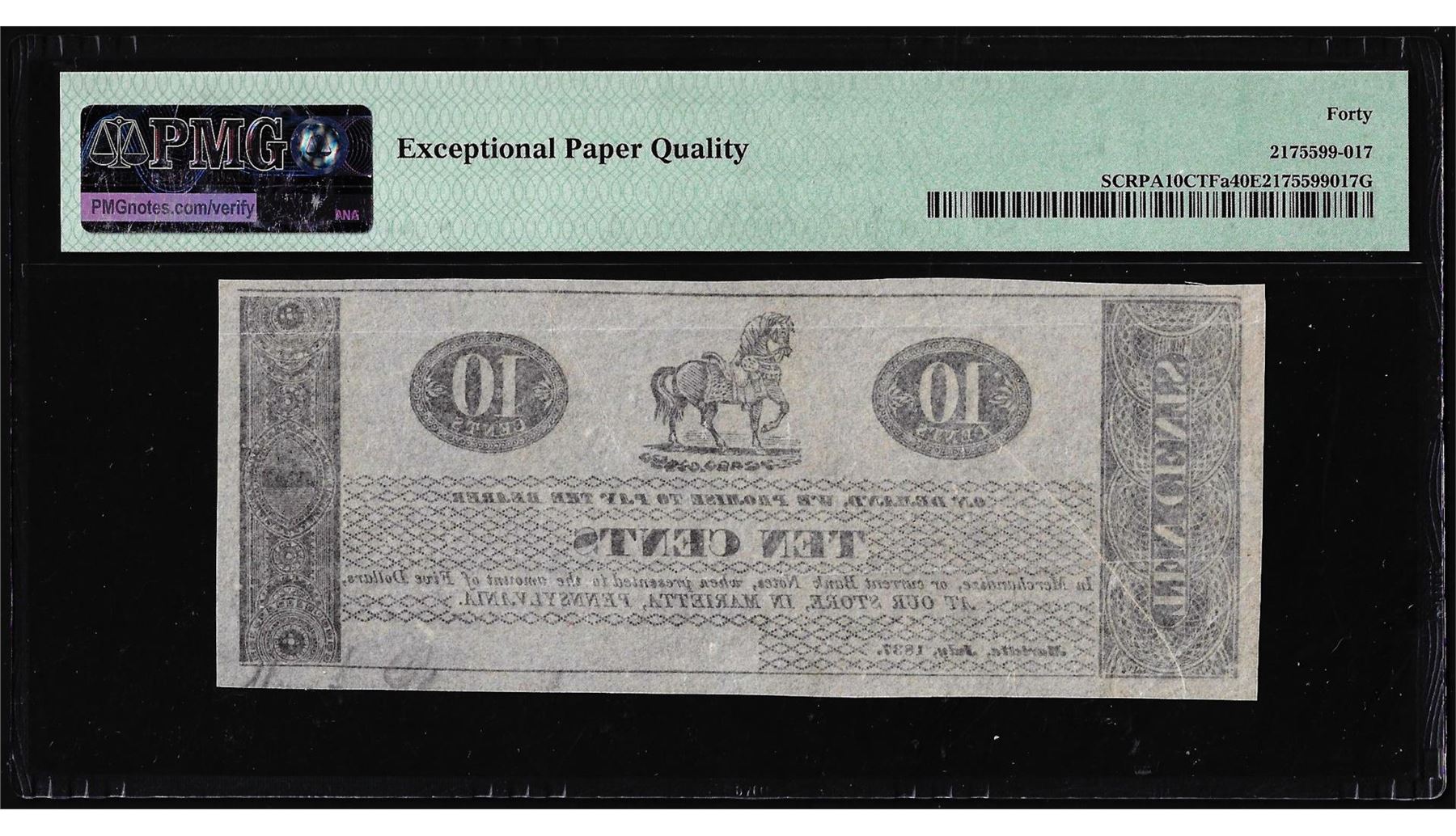 One 1837 Ten Cents Marietta, PA Barr Spangler's Remainder Note PMG Extremely Fine 40EPQ. PMG Certified.