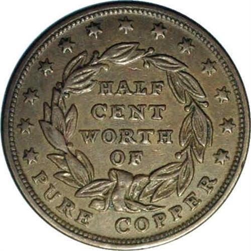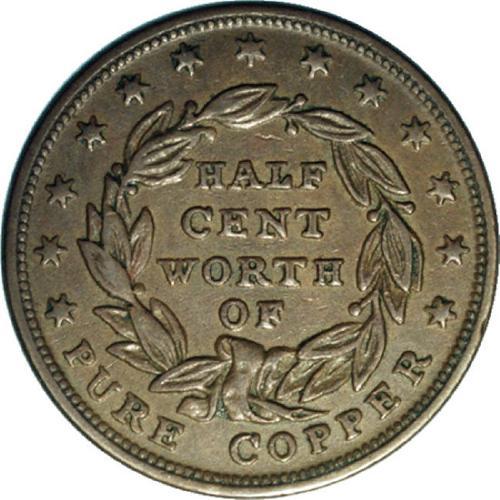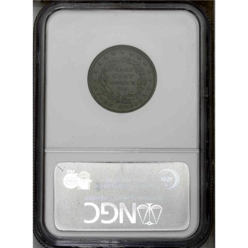 <B>1837 Token. Low-49, R.2. AU58 NGC. XF40 EAC.</B></I> Eagle; Wreath. Not part of the American Half Cent series, but usually collected as such. This is the <I>only</B></I> Hard Times Token of the half cent denomination. Hard Times Tokens were issued at a time when Federal coinage was scarcely seen in circulation. Some Hard Times Tokens were political or satirical, while others were merely advertising trade pieces. Very few, such as this issue, took a neutral position. John Ford once called these "neutral money substitutes." Walter Breen traced this token to one Edward Hulseman of New York City. He based this attribution on punch linkage to tokens known by that engraver. Gorgeous olive-brown surfaces with traces of corrosion visible only with a glass.<BR><I>Ex: "Woody" Blevins (12/31/1984).</B></I> Envelope Included.