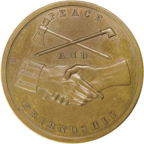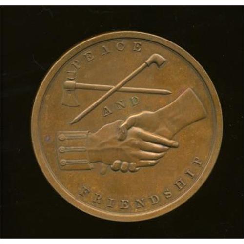 <B>1837 Van Buren Indian Peace Medal, Julian-IP-17, First Size, Second Reverse, Select BU Uncertified.</B></I> Bronzed copper, 76 mm, rim 7 mm, 255.4 gm. Obverse by Moritz Furst, reverse by John Reich. Bust right, rev. clasped hands, tomahawk, pipe, legend PEACE AND FRIENDSHIP. Second reverse, with flat-topped A's and finger pointing between F and R in FRIENDSHIP. Original obverse die with recut 1 and 7 in date, and recut ES in STATES. A lustrous milk-chocolate-brown piece with tinges of mint red lurking in the peripheries, with highly reflective fields and considerable prooflikeness in evidence. A few stray flecks of carbon are noted but undistracting, along with some light obverse hairlines and trivial contact marks on the reverse. Select BU, not far from Choice, and offering generous appeal. <BR><BR><b>Shipping:</b> Coins & Currency (<a target="_blank" href="http://www.heritageauctions.com/common/shipping.php">view shipping information</a>)