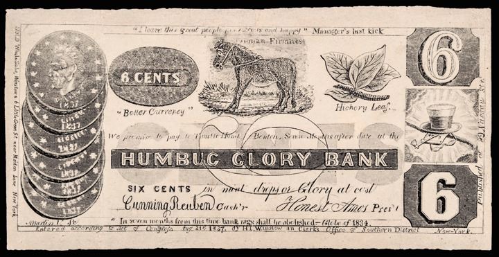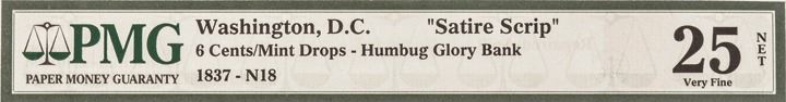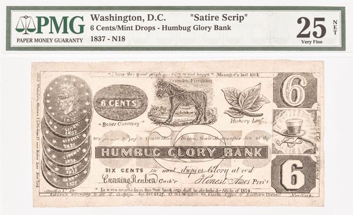 1837 Washington, DC. HUMBUG GLORY BANK 6 Cents Political / Satirical “Mock” Bank Note PMG Very Fine-25