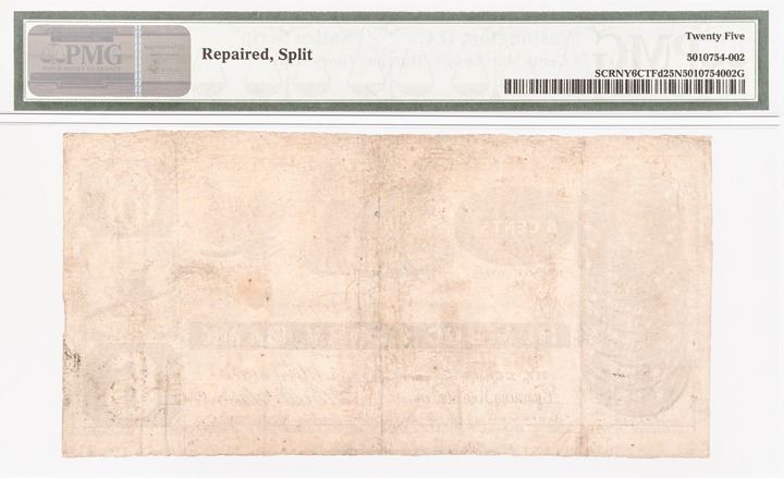 Haxby-Not listed. HT-XXX in Russ Rulau’s: “Standard Catalog of United States Tokens, 1700-1900”. See Stack’s Ford. An Extremely Rare major type. Printed on thin wove paper and well centered within four very large even margins. Net grade noted for repaired split on its holder. This Political / Satirical “mock” bank note parodies the "shinplasters" of the 1837 panic. Based on the division of the Spanish dollar, which was common during the Panic of 1837 with the emergency suspension of the specie (i.e. money in coin) payments by New York banks on May 10 of that year. The note is payable to "Tumble Bug Benton" Missouri senator and hard-money advocate Thomas Hart Benton, and is signed by "Cunning Rueben [Whitney], anti-bank advisor to Jackson and Van Buren, Cash'r, and "Honest Amos [Kendall], postmaster General and Van Buren advisor. There are several stacked coins with the head of Andrew Jackson on the left hand side, a jackass with the title "Roman Firmness", a hickory leaf (referring to Jackson' nickname of "Old Hickory), and a vignette showing Jackson's hat, clay pipe and spectacles, hickory stick and veto of the 1832 bill to recharter the Bank of the United States. At the top of the bill is a quote from Jackson's March 1837 farewell address, "I leave this great people prosperous and happy."