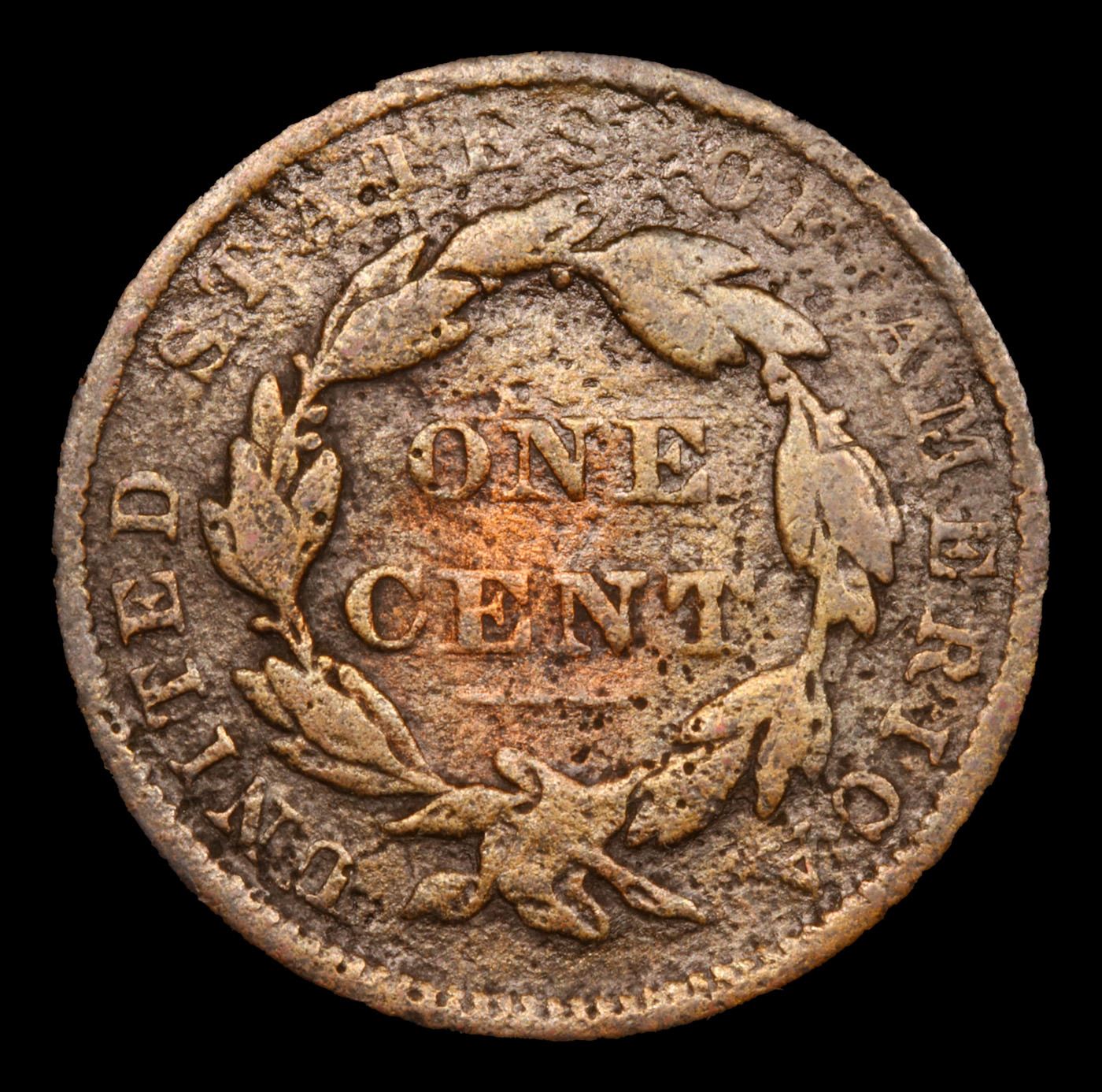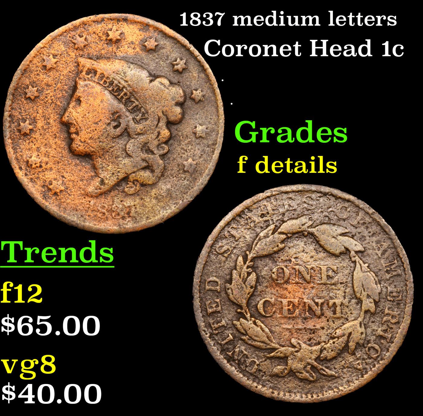 1837 medium letters Coronet Head Large Cent 1c Grades f details.
