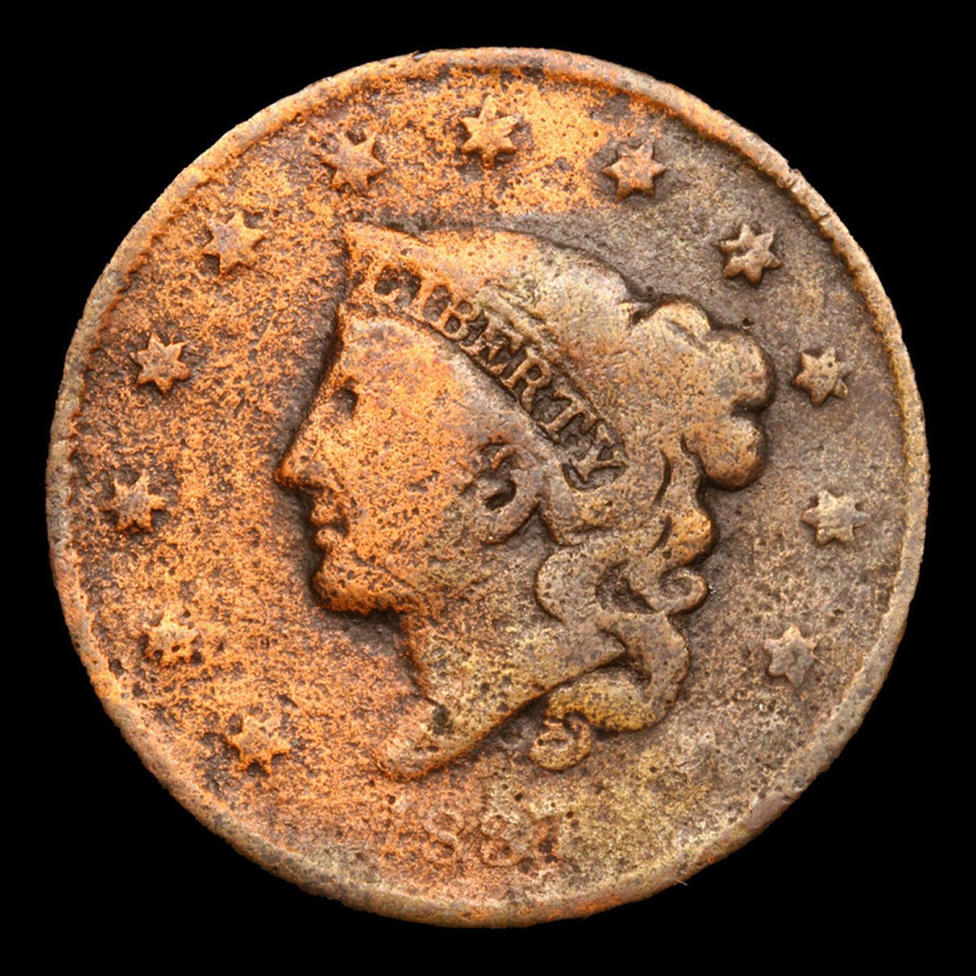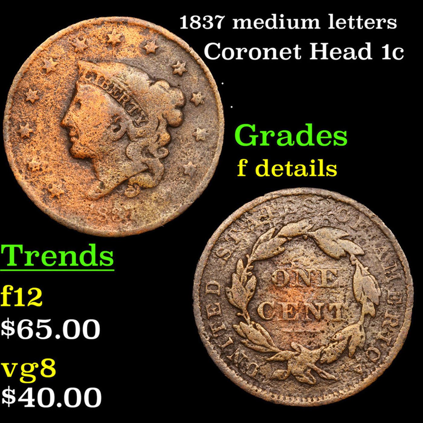 1837 medium letters Coronet Head Large Cent 1c Grades f details.