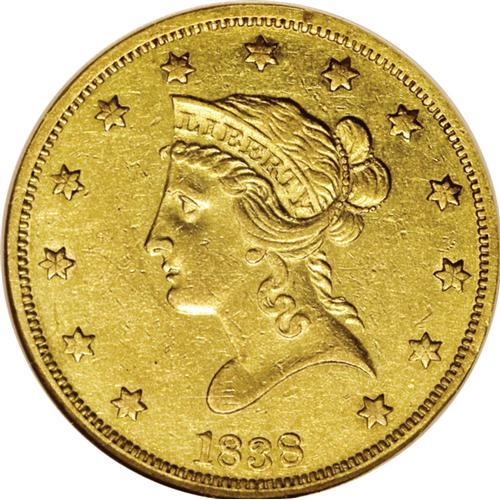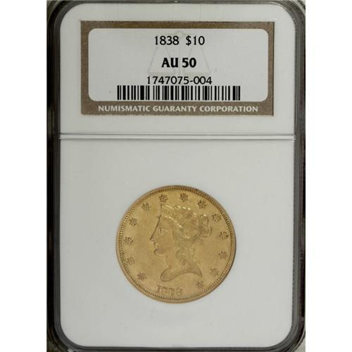 1838 $10 AU50 NGC. With only 7,200 pieces produced and