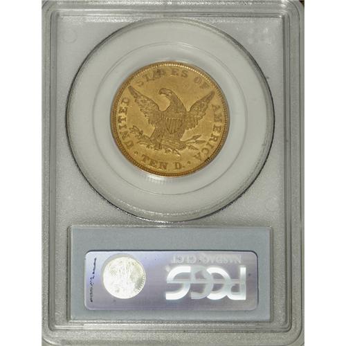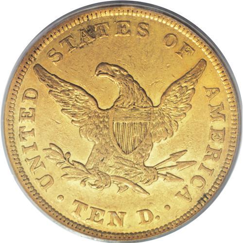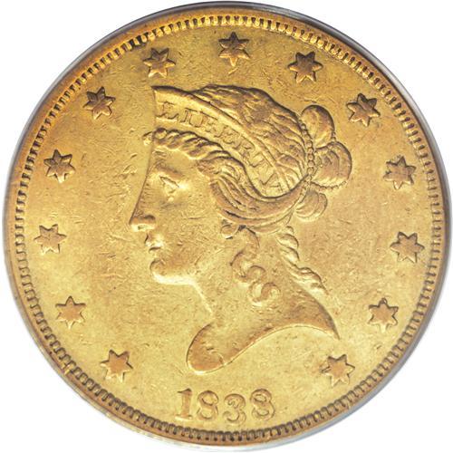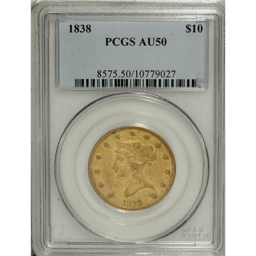 <B>1838 $10 AU50 PCGS.</B></I> The 1838 eagles were the first of the denomination struck since 1804. Because the design was altered in 1839, only the 1838 and 1839/8 eagles are available to represent the subtype, most easily distinguished from the redesign by the pointed bust truncation at the rear of Liberty's bust, which hovers directly over star 13. Only 7,200 pieces of this issue were coined, few of which survive today in Mint State. This piece offers brownish-gold surfaces with some faint prooflikeness still visible in the protected areas around the devices. The coin is fairly well struck, but numerous abrasions dot the obverse in particular. Population: 6 in 50, 16 finer (3/07).<BR><BR><b>Shipping:</b> Coins & Currency (<a target="_blank" href="http://www.heritageauctions.com/common/shipping.php">view shipping information</a>)