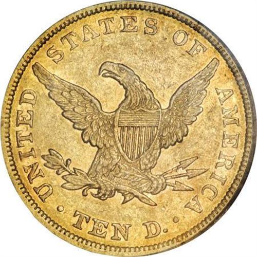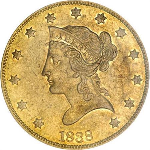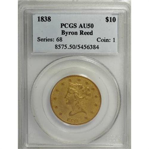 <B>1838 $10 AU50 PCGS.</B></I> Ex: Byron Reed. After an intermission of more than three decades, ten dollar gold pieces were again produced in 1838. Christian Gobrecht's initial design was modified the next year, in essence creating a two year sub-type. The obverse design, with minor modifications, was also used on half eagles and large cents in 1839, and appeared on half cents in 1840. The first type produced in 1838 and 1839, has Liberty's bust line noticeably curved, with a sharp point at the back of the shoulder. Later issues have the bust line nearly flat.<BR> This piece has lightly abraded and muted yellow-gold surfaces with hints of green color, and traces of reflective luster in the protected areas around the devices. A small diagonal nick in the left obverse field, about nose level, is a convenient pedigree marker.<BR><I>Ex: Byron Reed Collection (Spink America, 10/1996), lot 155.</B></I><BR><BR><b>Shipping:</b> Coins & Currency (<a target="_blank" href="http://www.heritageauctions.com/common/shipping.php">view shipping information</a>)