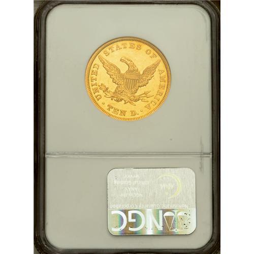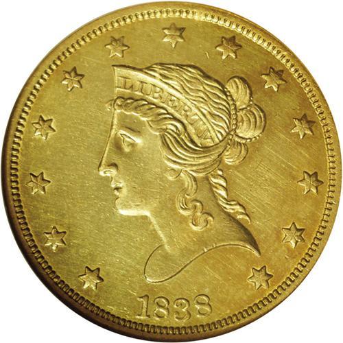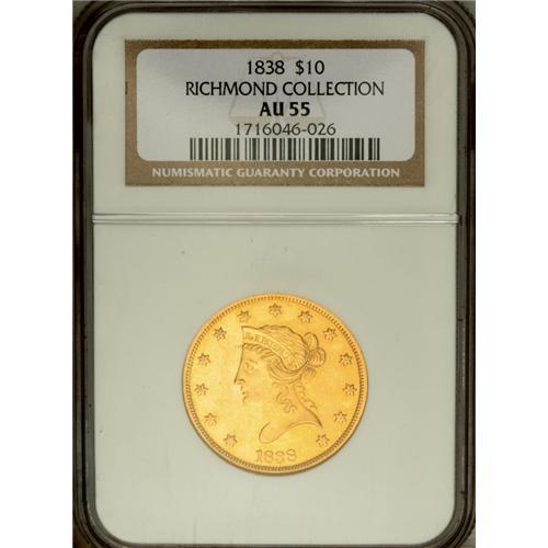 <B>1838 $10 AU55 NGC.</B></I> Ex: Richmond Collection. The gold-orange fields of this attractive piece retain nearly all of their considerable reflectivity. Light wear is present on the highpoints, but in light of the center's bold detail, this is not so troublesome as one might think. Fine handling marks on the open surfaces and a touch of peripheral softness are similarly minor quibbles. Census: 4 in 55, 7 finer (12/06).<BR><BR><b>Shipping:</b> Coin/Currency (<a target="_blank" href="http://www.heritageauctions.com/common/shipping.php">view shipping information</a>)