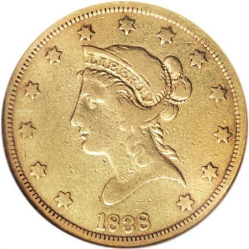 <B>1838 $10 VF20 NGC.</B></I> The warm honey-gold surfaces of this moderately circulated piece remain surprisingly luminous. Faint, scattered abrasions affect both sides, and a rim bruise is noted near 10 o'clock on the reverse rim. Still, a pleasing example of this noteworthy issue, the first eagle struck for commerce since 1804, with a mintage of just 7,200 pieces. Census: 1 in 20, 33 finer (8/07).<BR><BR><b>Shipping:</b> Coins & Currency (<a target="_blank" href="http://www.heritageauctions.com/common/shipping.php">view shipping information</a>)