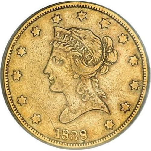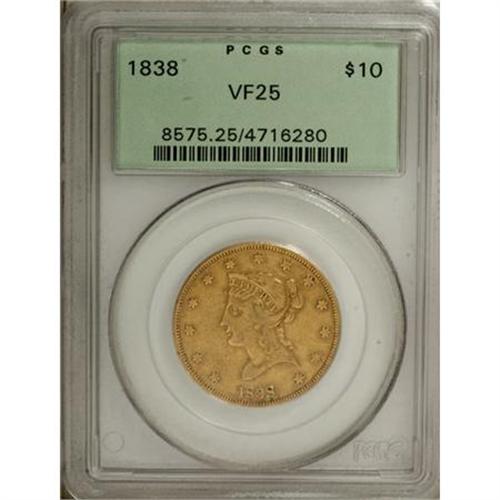 <B>1838 $10 VF25 PCGS.</B></I> The "Head of 1838" was struck for only two years, with the 1838 several times rarer than the 1839 Head of 1838. A portion of the 1838 mintage was struck from melted down British gold sovereigns provided by James Smithson's will. An unexpectedly sharply detailed peach-gold piece. Scratches are noted near star 1 and the I in AMERICA. Housed in a green label holder. Population: 5 in 25, 44 finer (11/07).<BR><I>From The Casa Becca del Norté Collection.</B></I><BR><BR><b>Shipping:</b> Coins & Currency (<a target="_blank" href="http://www.heritageauctions.com/common/shipping.php">view shipping information</a>)