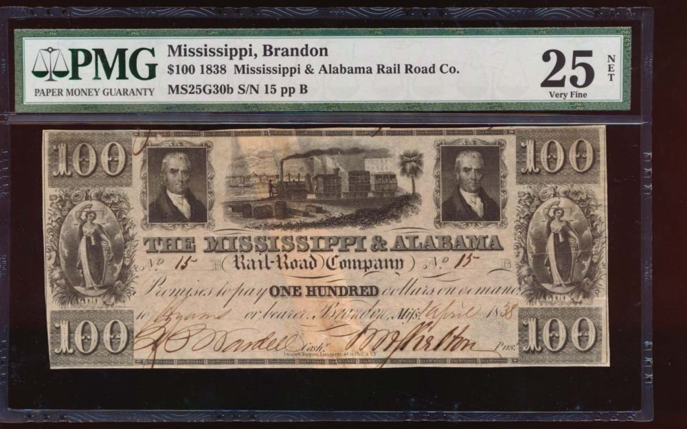 One 1838 $100 Mississippi and Alabama Rail Road Co Obsolete Note PMG 25NET.