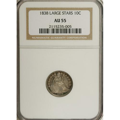 <B>1838 10C Large Stars AU55 NGC.</B></I> NGC Census: (6/253). PCGS Population (15/188). Mintage: 1,992,500. Numismedia Wsl. Price for NGC/PCGS coin in AU55: $180. (#4568)<BR><BR><b>Shipping:</b> Coins & Currency (<a target="_blank" href="http://www.heritageauctions.com/common/shipping.php">view shipping information</a>)