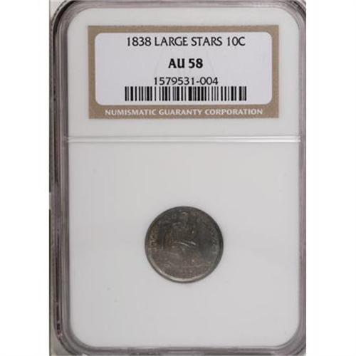 <B>1838 10C Large Stars AU58 NGC.</B></I> . NGC Census: (41/219). PCGS Population (21/174). Mintage: 1,992,500. Numismedia Wsl. Price for NGC/PCGS coin in AU58: $210. (#4568)<BR><BR><B>Coin Engraver:</B> Christian Gobrecht<BR><BR><b>Shipping:</b> Coins & Currency (<a target="_blank" href="http://www.heritageauctions.com/common/shipping.php">view shipping information</a>)