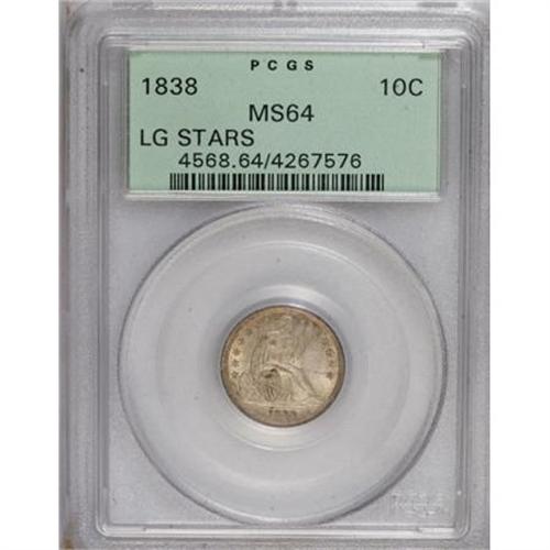 <B>1838 10C Large Stars MS64 PCGS.</B></I> Crisply struck on all of the design elements and denticles, with appealing satin luster and slight amounts of speckled patina near the peripheral devices. Free of noticeable marks on both sides. Housed in an green label holder. Population: 61 in 64, 40 finer (8/07). <BR><BR><B>Coin Engraver:</B> Christian Gobrecht<BR><BR><b>Shipping:</b> Coins & Currency (<a target="_blank" href="http://www.heritageauctions.com/common/shipping.php">view shipping information</a>)
