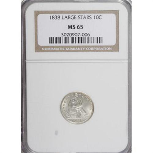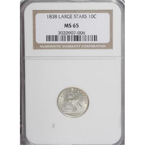 <B>1838 10C Large Stars MS65 NGC.</B></I> The Large Stars 1838 dime can be distinguished from the Small Stars variety by the fact that the latter, according to Brian Greer (1992): "Always (has) a die crack through the first six stars." The Gem in this lot does not possess this crack. Essentially untoned surfaces yield strong luster and are free of disturbing marks. An impressive strike brings out nice definition on the design features. Census: 39 in 65, 34 finer (6/07).<BR><BR><b>Shipping:</b> Coins & Currency (<a target="_blank" href="http://www.heritageauctions.com/common/shipping.php">view shipping information</a>)