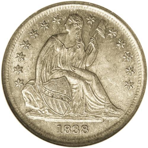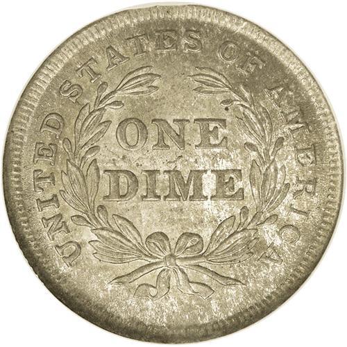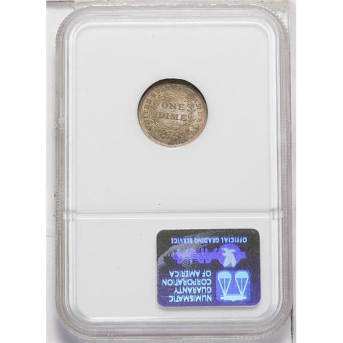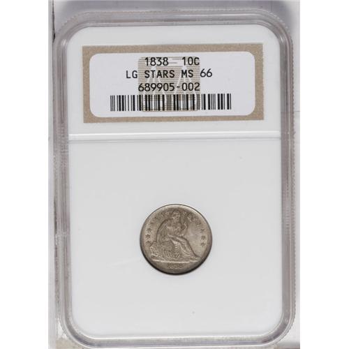 <B>1838<10C> Large Stars MS66 NGC.</B></I> Greer-106. A die flaw in the reverse field between the words ONE and DIME is the diagnostic feature of this variety. As an issue, the 1838 Large Stars is common in circulated grades, but becomes progressively more difficult to locate the higher one progresses up the Mint State grading sale. With smooth, frosty surfaces and sharp striking detail over the focal features, this Premium Gem would do justice to the finest Seated dime collection. Both sides are free of distracting abrasions with deep steel-gray and reddish-golden toning. An important representative of the Greer-106 die marriage. Census: 25 in 66, 10 finer (7/06).