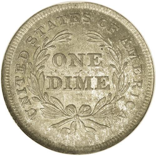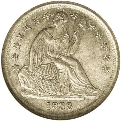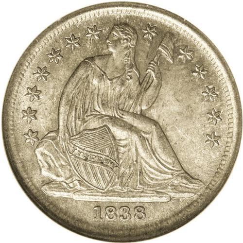 <B>1838<10C> Large Stars MS66 NGC.</B></I> Greer-106. A die flaw in the reverse field between the words ONE and DIME is the diagnostic feature of this variety. As an issue, the 1838 Large Stars is common in circulated grades, but becomes progressively more difficult to locate the higher one progresses up the Mint State grading sale. With smooth, frosty surfaces and sharp striking detail over the focal features, this Premium Gem would do justice to the finest Seated dime collection. Both sides are free of distracting abrasions with deep steel-gray and reddish-golden toning. An important representative of the Greer-106 die marriage. Census: 25 in 66, 10 finer (9/06).