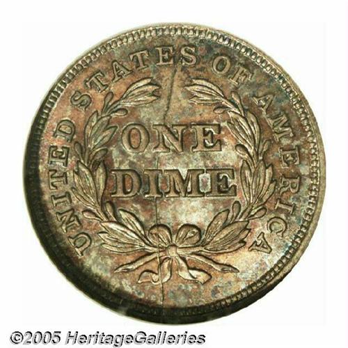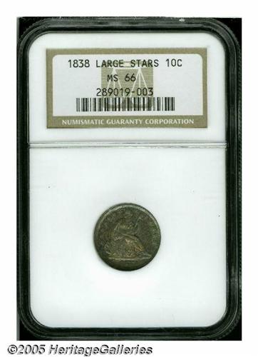 <B>1838<10C> Large Stars MS66 NGC.</B></I> This short-lived subtype, which displays no drapery from Liberty's elbow and has a tilted shield, was produced only from 1838 through 1840. The impeccable Gem offered here is bathed in splotches of cobalt-blue, golden-brown, and lavender patina. The fields are partially prooflike, and over a pleasing contrast with the sharply struck design elements. A vertical die crack bisects the reverse. Population: 24 in 66, 11 finer (6/05).<BR><I>From The Melrose Bay Collection.</B></I>