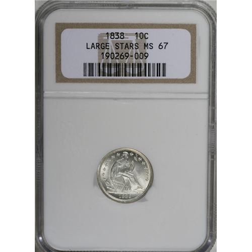 <B>1838 10C Large Stars MS67 NGC.</B></I> While the Large Stars variety is more common than its Small Stars cousin, neither is available with any frequency as a Superb Gem. This piece is an essentially untoned example that has attained that lofty grade, solidly struck with vibrant, pleasing luster. An interesting curved die gouge is noted between ONE and DIME on the reverse. Census: 8 in 67, 2 finer (10/06).<BR><I>From The Jones Beach Collection.</B></I><BR><BR><b>Shipping:</b> Coin/Currency (<a target="_blank" href="http://www.heritageauctions.com/common/shipping.php">view shipping information</a>) <BR><BR><B>Important notice:</