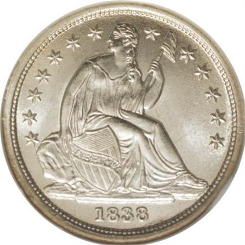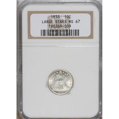 <B>1838 10C Large Stars MS67 NGC.</B></I> Fortin-105. A lustrous and precisely struck Superb Gem whose sparkling surfaces display only a hint of gold patina. Stars 9 and 13 are boldly repunched, since stars were added by hand to the working die for this issue.<BR><BR><b>Shipping:</b> Coins & Currency (<a target="_blank" href="http://www.heritageauctions.com/common/shipping.php">view shipping information</a>)