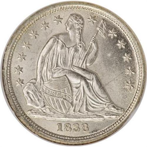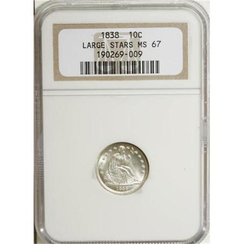 <B>1838 10C Large Stars MS67 NGC.</B></I> Fortin-105. A lustrous and precisely struck Superb Gem whose sparkling surfaces display only a hint of gold patina. Stars 9 and 13 are boldly repunched, since stars were added by hand to the working die for this issue. This dazzling coin is virtually perfect. Of interest is the metal flow that is seen around the margins on each side.<BR><BR><B>Coin Engraver:</B> Christian Gobrecht<BR><BR><b>Shipping:</b> Coins & Currency (<a target="_blank" href="http://www.heritageauctions.com/common/shipping.php">view shipping information</a>)