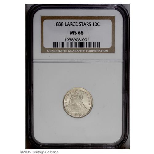 <B>1838<10C> Large Stars MS68 NGC.</B></I> Variety 106. Cracked Obverse #1 exhibits a significant die crack starting at the rim between Stars 6 and 7, then through Liberty's left side and exiting through the shield point into a space between the 1 and 8 digits to the rim. Surprisingly the obverse still comes well struck even with the severity of the die crack. In 1838, Christian Gobrecht added stars to the obverse design of the Seated Liberty Dime. The earliest working dies of this type (1838-1840) were sunk from the No Stars hub of 1837, with the stars being entered individually and by hand. Unsurpassable technical quality for this important issue, both sides are satiny and untoned. This is a fully impressed and exceptionally smooth example. It is tied with one other at NGC as the finest known, PCGS has yet to certify an MS68 (10/05).