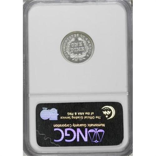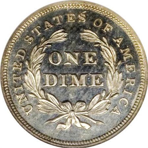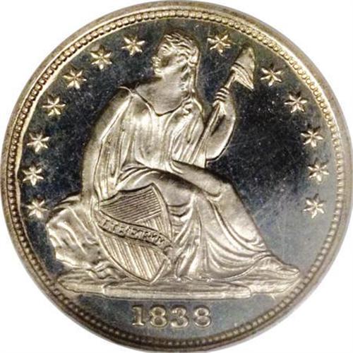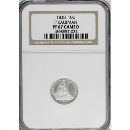 <B>1838 10C No Drapery PR67 Cameo NGC.</B></I> Ex: P. Kaufman. Of all the amazing coins in the Phil Kaufman Collection, this 1838 Superb Gem Cameo proof dime is perhaps the most incredible. It is not only the solitary Cameo certified by either NGC or PCGS, is also the <I>only</B></I> proof example of the date seen by either service. This is not surprising, as the 1838 proof dime is an extremely rare issue. Indeed, little mention is made of it in the numismatic literature. Breen's 1988<I> Encyclopedia</B></I> gives only a question mark for the mintage figure, but then says "At least three proofs known." Many famous collections offered in the last several years lacked a proof example of this issue, including the Norweb, Lovejoy, Eliasberg, and Pittman collections. While Breen suggests the possibility of three known proofs, it is also possible that this piece is unique in proof.<BR><BR>The only references to the appearance of 1838 proof dimes in public auctions are made in another of Breen's treatises, his <I>Encyclopedia of United States and Colonial Proof Coins, 1722-1977</B></I>. Breen cites the F. C. C. Boyd-Adolph Friedman specimen, and the Samuel W. Wolfson example. Unfortunately, none of the appearances includes a photograph of the sale specimen, preventing us from determining whether the Kaufman coin matches any of them. In fact, we are unable to recall seeing so much as a photo of a proof 1838 dime in the various references. We do, however, present the catalog description for each of those appearances. <BR><BR>1. Numismatic Gallery, <I>World's Greatest Collection</B></I>, Boyd, May 11-12, 1945, lot 510: "1838. K-1 (A. Kosoff attribution). Stars on obverse... . No drapery. Perfect die. Brilliant proof, scarce. Estimate Price $15.00." Price realized was $27.50; Numismatic Gallery, Friedman, August 20-21, 1946, ANA, lot 261: "K-1. With Stars. No drapery. Perfect die. Brilliant proof. Rare. (W.G.C.) Estimate Price $27.50." Price realized was $32.50.<BR><BR>2. "Impaired" (per Breen). Stack's May 3, 4, 1963, Samuel W. <I>Wolfson Collection of United States Coins</B></I>, Part II, Silver and Copper Coins, lot 530: "1838 Large Stars. A Proof impression. The obverse field is a trifle rubbed." This piece realized $100 at the time.<BR><BR>Stars 1, 8, 9, and 12 are repunched, most notable on star 8, and these are the only visible die characteristics on either side. Otherwise, both dies were very well made. <BR><BR>The richly frosted motifs on the Kaufman coin stand out against the reflective fields, yielding magnificent cameo contrast. Additionally, a well executed strike brings about strong and uniform definition on the design features, including crispness on all of the star centers, Liberty's hair and gown lines, and the leaf ribbing. Immaculately preserved surfaces are virtually stone white, and devoid of mentionable marks. We can only discern a couple of tiny contacts, one occurring below the A in STATES and the other on the lower right of the O in ONE. We point these out solely for identification purposes, as this Superb Gem possesses no other pedigree markers. The technical quality and aesthetic appeal of this coin are unfathomable, making it highly desirable for the connoisseur of Seated Liberty proofs. It is conceivable that we will not see a proof 1838 dime on the market again for some time. <BR><BR>Mr. Kaufman tells us: " I bought this coin in 1999. I first saw it almost 10 years earlier and did not buy it because I felt it was overpriced. I ended up paying MUCH more in 1999." This is an important lesson for those attending the sale that feel the bidding is too strong. It may cost you much more in 2018!<BR><I>From The Phil Kaufman Collection of Early Seated Proof Sets, Part Two.</B></I><BR><BR><b>Shipping:</b> Coins & Currency (<a target="_blank" href="http://www.heritageauctions.com/common/shipping.php">view shipping information</a>)