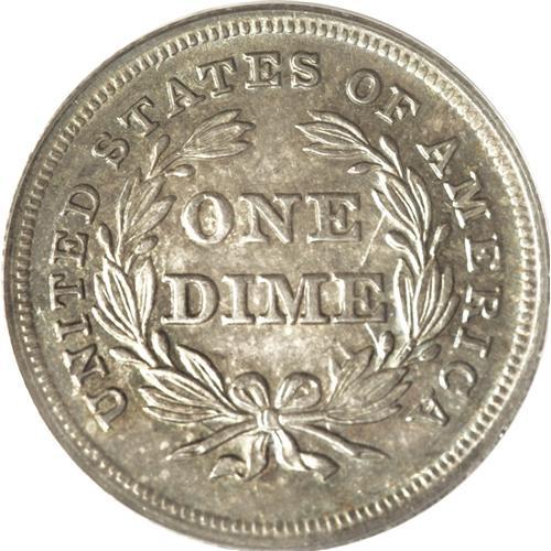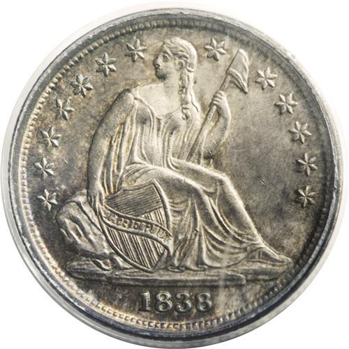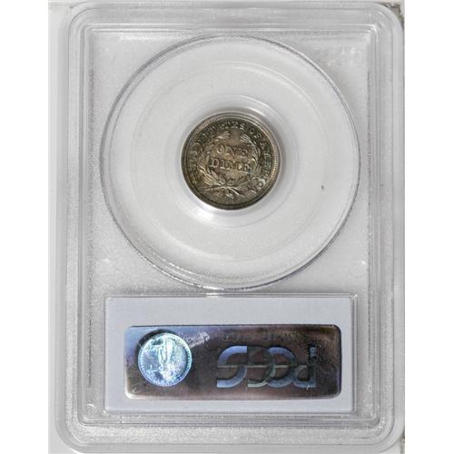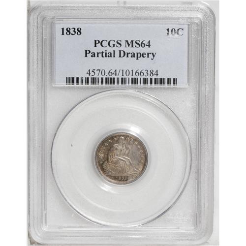 <B>1838<10C> Partial Drapery MS64 PCGS.</B></I> Drapery did not appear on dimes until 1840. The so-called Partial Drapery dime is actually caused by die clashing, with the slight straight line interpreted as drapery actually from the E in DIME on the reverse. The 1 in the date shows recutting on the top serif, and star 5 is boldly recut. Other bold clash marks show on the reverse. This lovely near-Gem boasts copper-gray and mint-green patina. Seldom seen so fine. Population: 3 in 64, 4 finer (7/06).