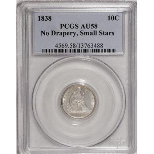 <B>1838 10C Small Stars AU58 PCGS.</B></I> This desirable early Seated variety also features nice reverse die doubling, with the D in DIME as the pickup point. Lightly toned and boldly struck with minimal marks. Very scarce this close to Mint State. Population: 10 in 58, 30 finer (2/08).<BR><BR><B>Coin Engraver:</B> Christian Gobrecht<BR><BR><b>Shipping:</b> Coins & Currency (<a target="_blank" href="http://www.heritageauctions.com/common/shipping.php">view shipping information</a>)