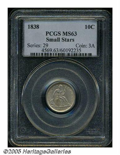 <B>1838<10C> Small Stars MS63 PCGS.</B></I> Milky-rose surfaces with nice matte luster. Some tiny contact marks are evident. Probably from near the end of obverse die's life, as a large die break has formed through many of the left obverse stars.