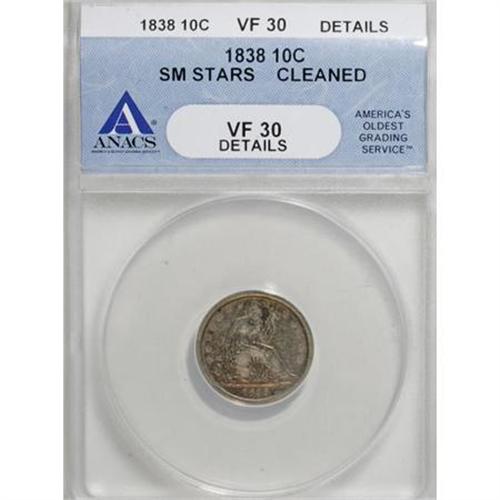 <B>1838 10C Small Stars--Cleaned--ANACS. VF30 Details.</B></I> NGC Census: (0/54). PCGS Population (1/54). Mintage: 1,992,500. Numismedia Wsl. Price for NGC/PCGS coin in VF30: $110. (#4569)<BR><BR><B>Coin Engraver:</B> Christian Gobrecht<BR><BR><b>Shipping:</b> Coins & Currency (<a target="_blank" href="http://www.heritageauctions.com/common/shipping.php">view shipping information</a>)