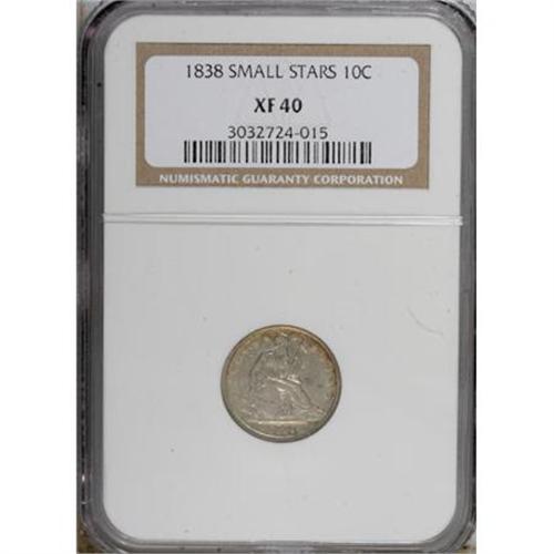 <B>1838 10C Small Stars XF40 NGC.</B></I> NGC Census: (2/51). PCGS Population (1/50). Mintage: 1,992,500. Numismedia Wsl. Price for NGC/PCGS coin in XF40: $140. (#4569)<BR><BR><B>Coin Engraver:</B> Christian Gobrecht<BR><BR><b>Shipping:</b> Coins & Currency (<a target="_blank" href="http://www.heritageauctions.com/common/shipping.php">view shipping information</a>\)