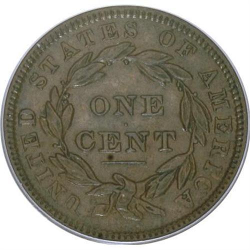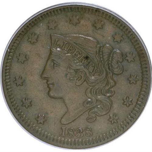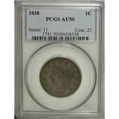 <B>1838 1C AU50 PCGS.</B></I> PCGS Population (25/302). NGC Census: (10/450). Mintage: 6,370,200. Numismedia Wsl. Price for NGC/PCGS coin in AU50: $158. (#1741)<BR><BR><B>Coin Engraver:</B> Robert Scot or John Reich<BR><BR><b>Shipping:</b> Coins & Currency (<a target="_blank" href="http://www.heritageauctions.com/common/shipping.php">view shipping information</a>)