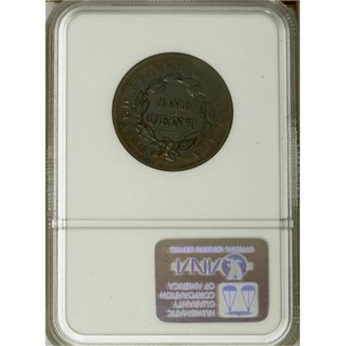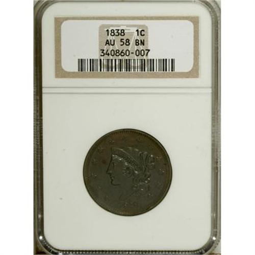 <B>1838 1C AU58 NGC.</B></I> NGC Census: (58/348). PCGS Population (40/204). Mintage: 6,370,200. Numismedia Wsl. Price for NGC/PCGS coin in AU58: $183. (#1741)<BR><BR><B>Coin Engraver:</B> Robert Scot or John Reich<BR><BR><b>Shipping:</b> Coins & Currency (<a target="_blank" href="http://www.heritageauctions.com/common/shipping.php">view shipping information</a>)